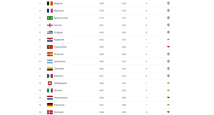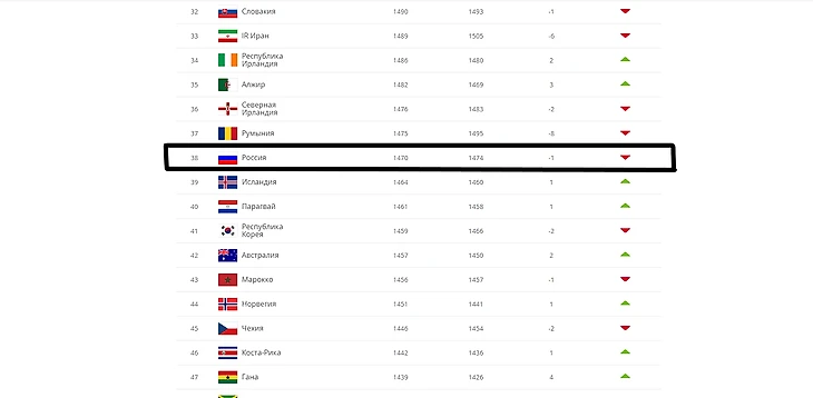 На протяжении квалификации они были на 14 месте, но по итогу опустились в рейтинге на две строчки, пропустив вперед Германию и Нидерланды. А сборная России по футболу находится на 38-ом месте.