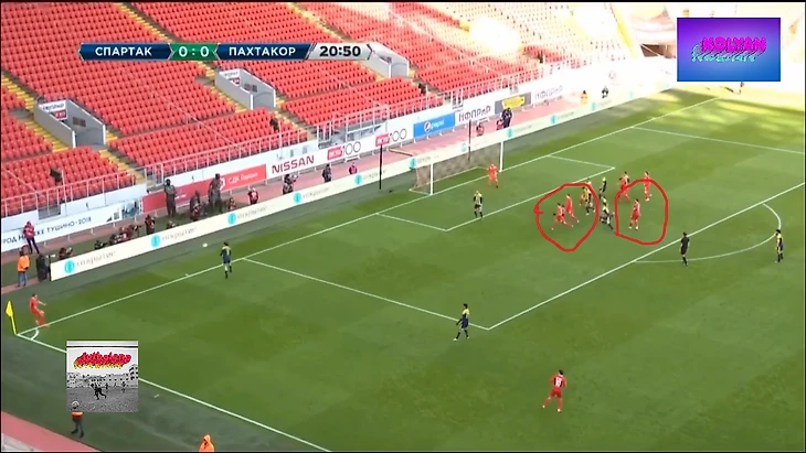 Зобнин пытается удержать мяч и подставляет спину под игрока «Пахтакора», тем самым заработав штрафной удар.