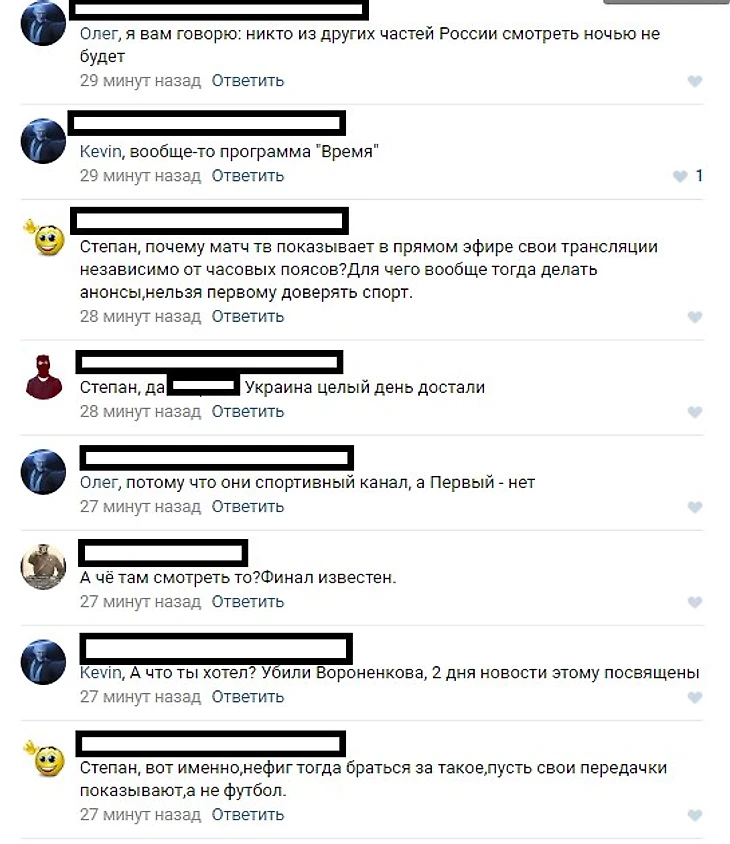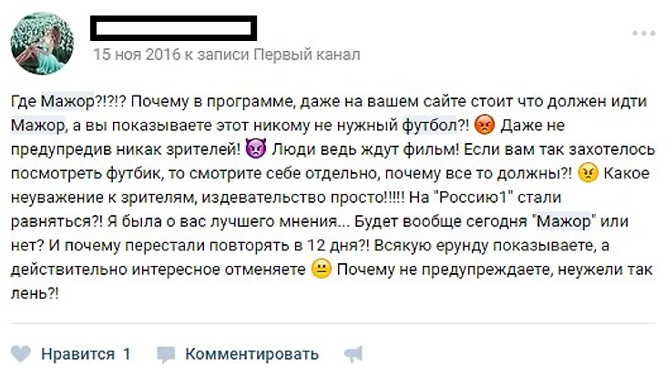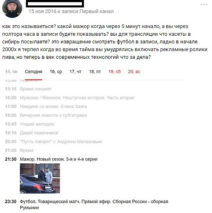Каждый раз во время игр сборной группу Первого канала ВК атакуют футбольные болельщики, которые хотят смотреть футбол. Хватает и фанатов сериалов, возмущающихся переносом из-за матчей. Но если сериал никак не пострадает от сдвига на более раннее-позднее время, то футбол смотреть в записи — особый вид извращения (особенно если дело касается матчей сборной России).