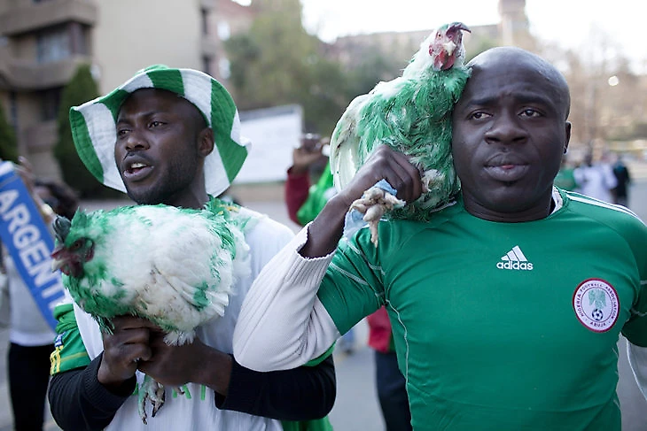 На самом деле ритуал с курицей существует – калининградские власти его не выдумали. Просто в последний раз мировые медиа писали о нем во время чемпионата мира-2010: тогда маленькая группа фанатов пыталась пронести двух священных куриц, приносящих удачу, на матч против Аргентины в Йоханнесбурге (0:1). На белых куриц баллончиком нанесли полосы традиционного для Нигерии зеленого цвета.