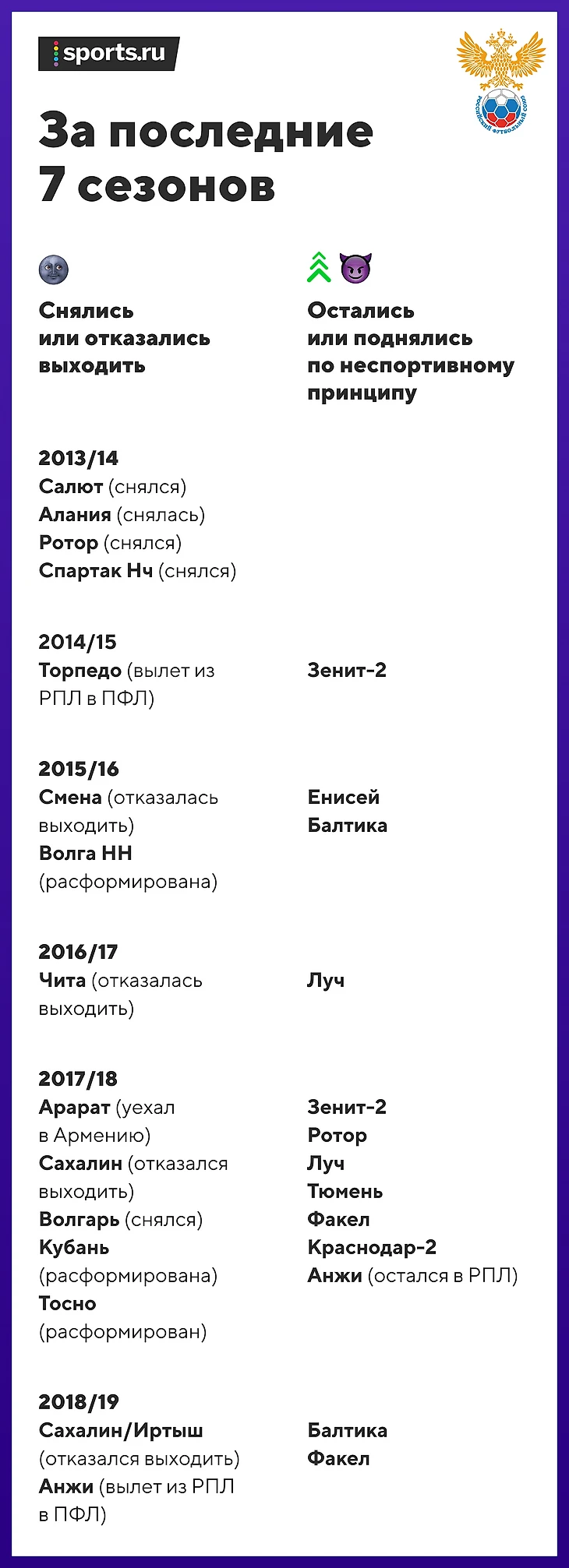 Например, по итогам сезона-2018/19 из ФНЛ должны были вылететь «Балтика», «Факел», «Сибирь», «Зенит-2» и «Тюмень». Но в ПФЛ спустились только трое: «Балтика» и «Факел» спаслись вопреки результатам и благодаря документам.