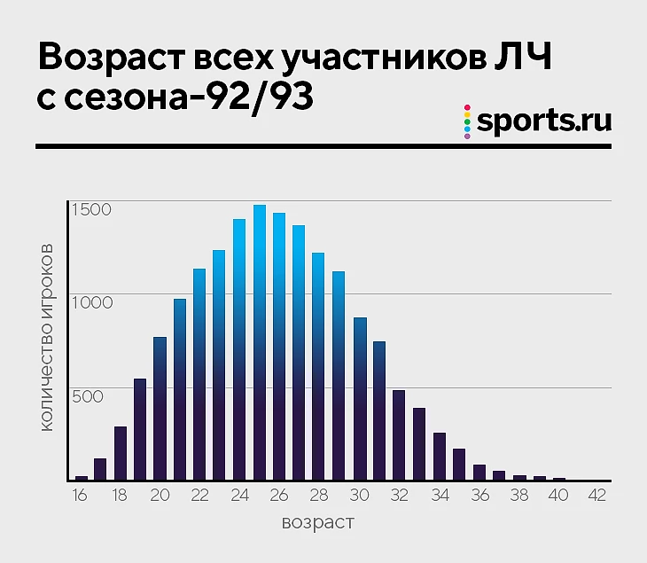 80% участников Лиги чемпионов – игроки от 21 до 29 лет. До и после доля резко снижается.