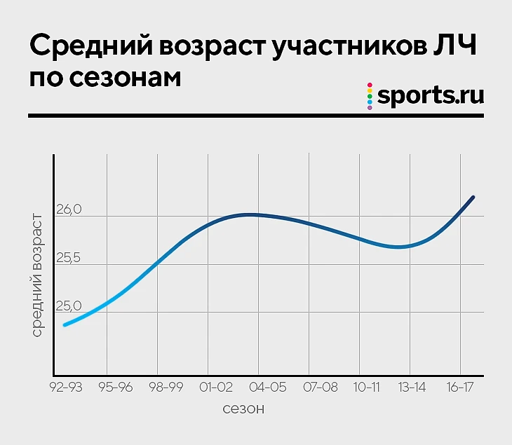 Средний возраст футболистов, выступавших в Лиге чемпионов с 1992-го по 2018-й, вырос на 1,6 года, но рост был неравномерным.
