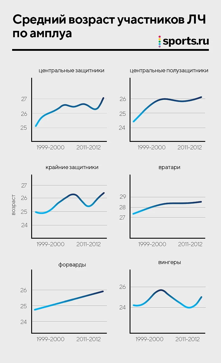 Главная ценность исследования в том, что это не просто подборка средних возрастов в разные годы, все куда глубже. В расчет брались несколько критериев: возраст, количество проведенных в клубе сезонов, количество выигранных Лиг чемпионов и командные показатели). Игроков поделили на шесть позиций (вратари, центральные защитники, крайние защитники, центральные полузащитники, вингеры и нападающие) и шесть возрастных групп: 16-20, 20-25, 26-30, 30-35 и старше 35. В выборку попали все футболисты, которые принимали участие в ЛЧ с момента ее создания – сезона-1992/93 и до сезона-2017/18 включительно. И вот главный вывод...