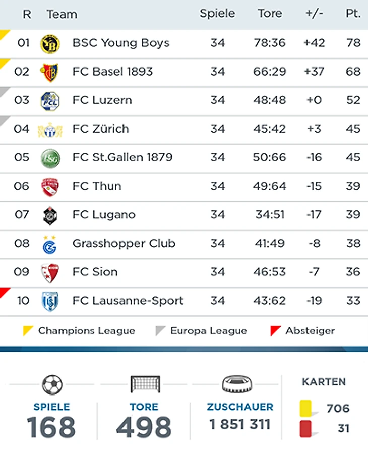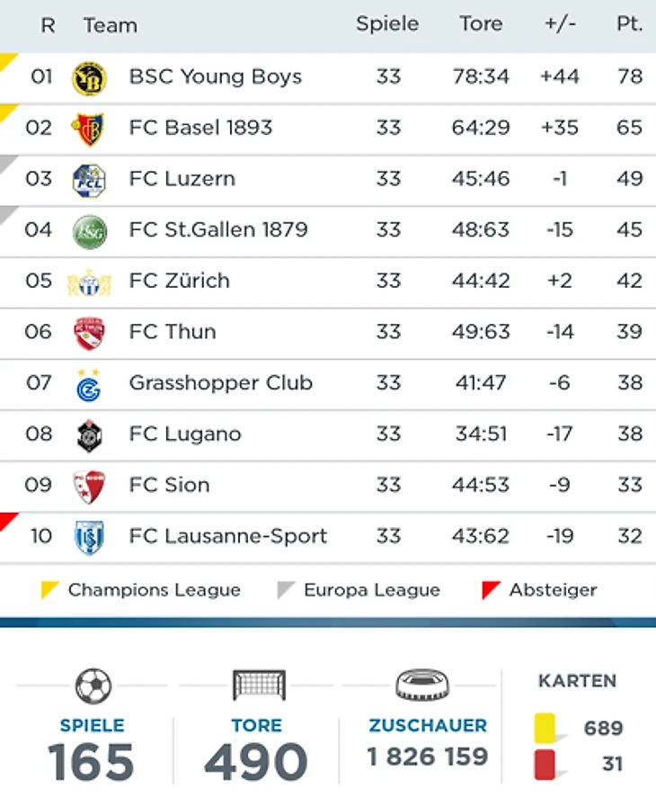 Игра в Базеле, в отличие от матча предыдущего круга на “Стад де Сюисс”, вышла не такой захватвающей и зрелищной. К тому же, неоправданно жёсткой: к перерыву Ади Хюттеру пришлось заменить травмированных Кассима Нуху и Кевина Мбабу, а хозяева остались без капитана Марека Сухи, ушедшего в подтрибунку с разбитой бровью. Не сказать, что игра была совсем уж односторонней, у “Янг Бойз” тоже было несколько острых моментов, но новый чемпион явно подходит к оставшимся играм менее серьёзно, чем, возможно, стоило бы. Рекорд по количеству набранных очков их, похоже, не волнует, важнее сохранить силы на предстоящий финал кубка 27 мая. В отличие от “Базеля”, для которого победа в оставшихся матчах - дело престижа. Да и многим базельским игрокам есть что доказывать тренерам сборных в преддверии Чемпионата Мира и скаутам европейских клубов - перед открытием трансферного окна.