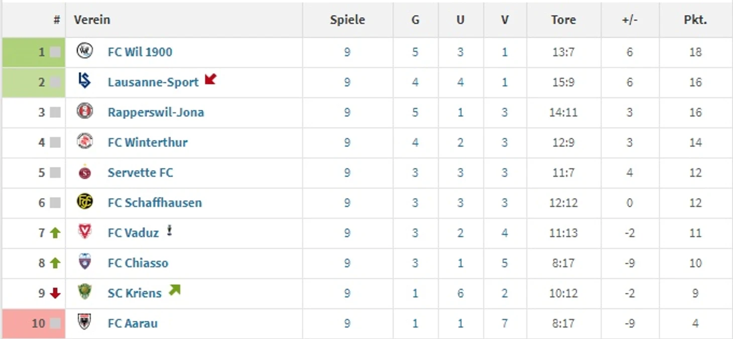 «Виль» ровно прошёл эти девять туров, допустив осечку лишь во втором – против «Шаффхаузена» (0:2). В остальных же поединках команда забивала ровно столько, сколько было нужно для общего успеха. Фюнфштюк использует схему с тремя центральными защитниками, среднюю линию цементируют Зе Эдуардо и Сандро Ломбарди. Во многом это привело к тому, что по воротам команды допущено крайне мало ударов, а уж в створ ворот из них долетело меньше 30%. Вообще же, команда смотрится довольно мощно, игроки точно знают, что от них хочет тренер, и оказываются ровно в тех местах по ходу матча, каких требует ситуация. И чем дальше мы погружаемся в перипетии лиги, тем интереснее за этой командой наблюдать.