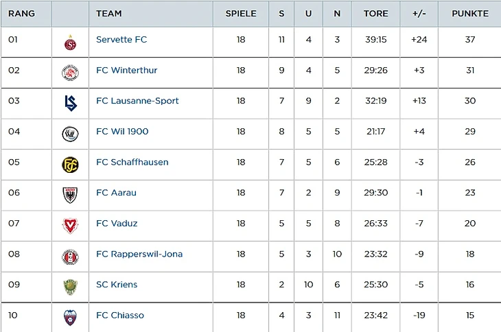 В роли догоняющих явно выступают три команды – «Винтертур», «Лозанна» и «Виль 1900», а также, с натяжкой, «Шаффхаузен». «Виль 1900» после яркого первого круга ощутимо просел, потерпев сразу четыре поражения во втором. Конрад Фюнфштюк продолжает придерживаться выбранной тактики, которая принесла ему успех в первой части, но на фоне средней высокой результативности лиги быть самой малозабивающей командой невыгодно. Тем не менее, пока «Виль» держится наверху, но с атакой и результативностью придётся поработать этой зимой. Хотя прогресс в сравнении с прошлым годом очевиден: +18 очков. «Винтертур» играет на уровне своих максимальных возможностей. От команды сложно будет ждать борьбы за зону стыков, учитывая крайне нестабильную игру в обороне. Пока эффективная атака закрывает всю дырявость обороны, но есть ощущение, что вечно это продолжаться не будет. В команде ощутимо не хватает форвардов: Лука Слискович и Таулант Сефери – вот и все варианты. От Мануэля Зуттера, не забивавшего в рамках лиги больше года, уже избавились. Видимо, идёт поиск эффективной атаки. Подносчики снарядов для неё есть.