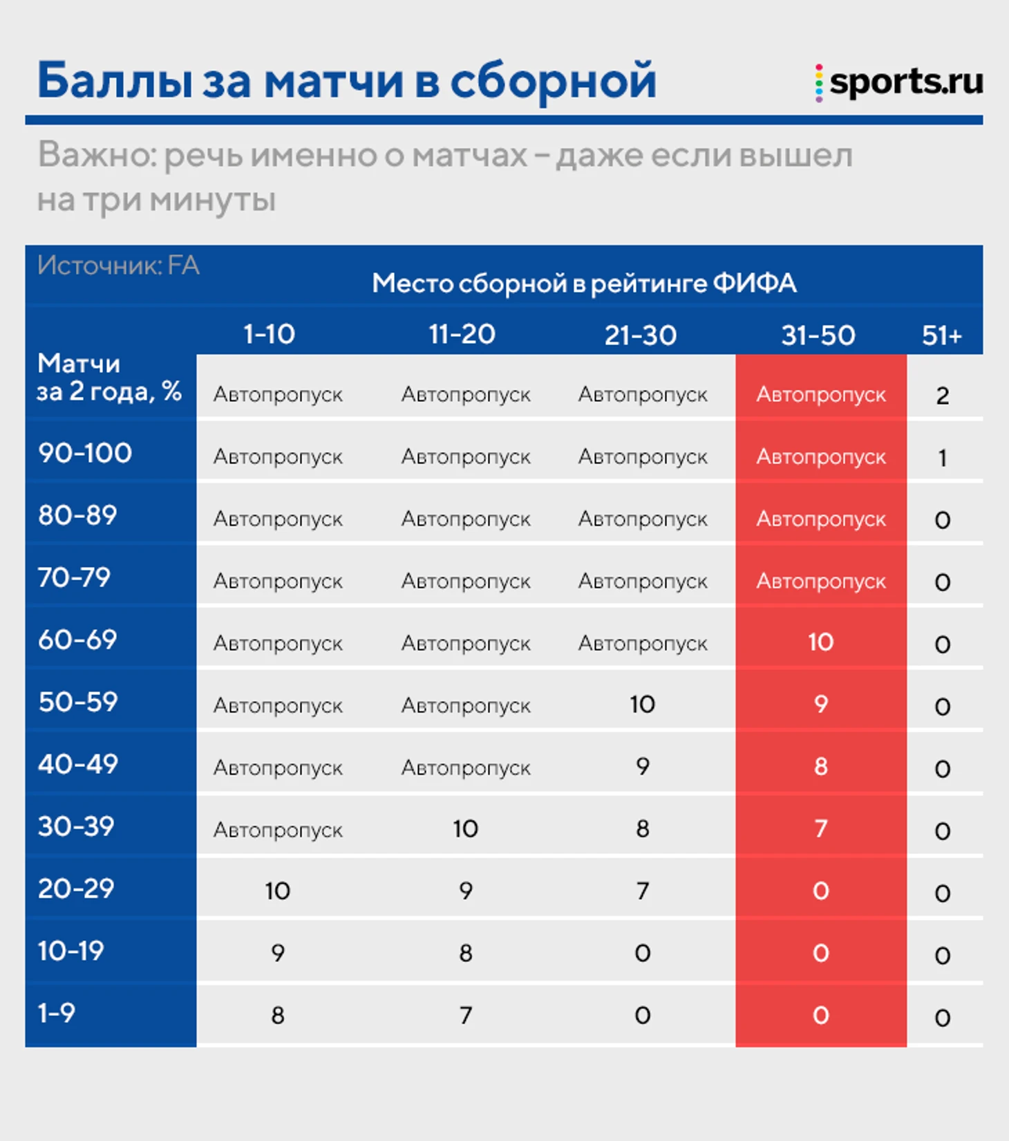 Или можно автоматически легализоваться через сборную – чем выше место в рейтинге ФИФА, тем меньше матчей нужно сыграть для автопропуска.