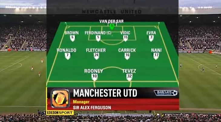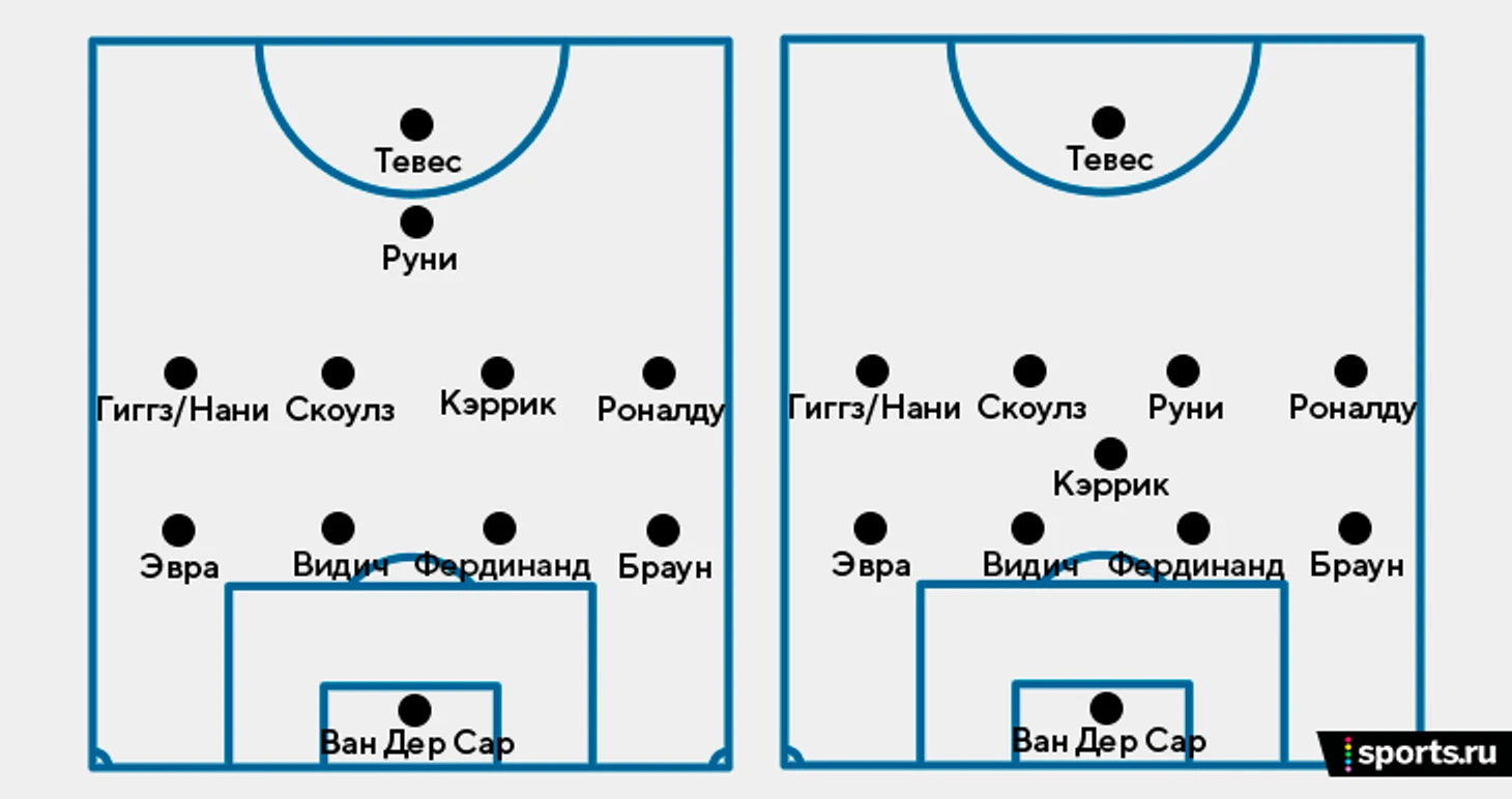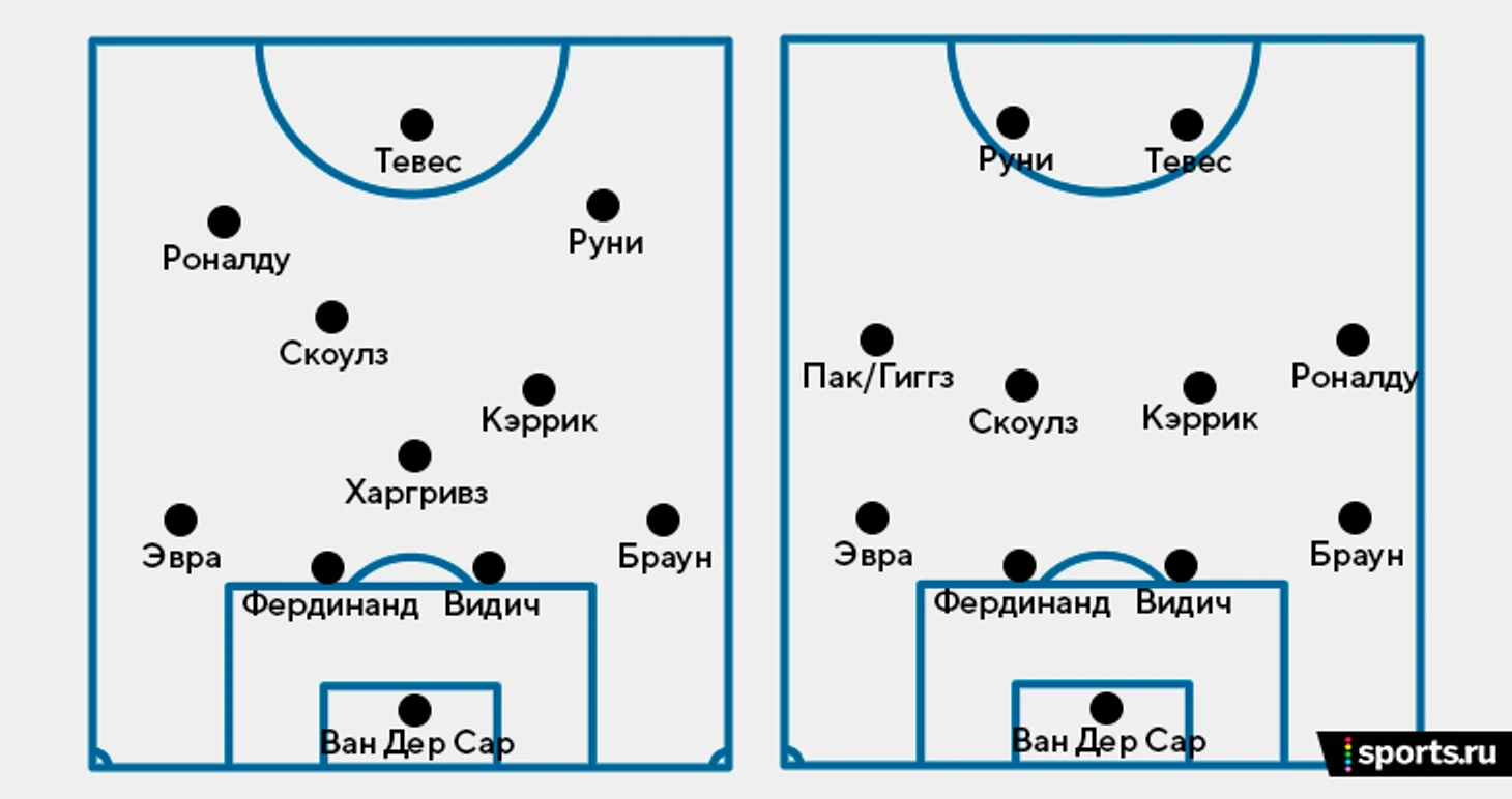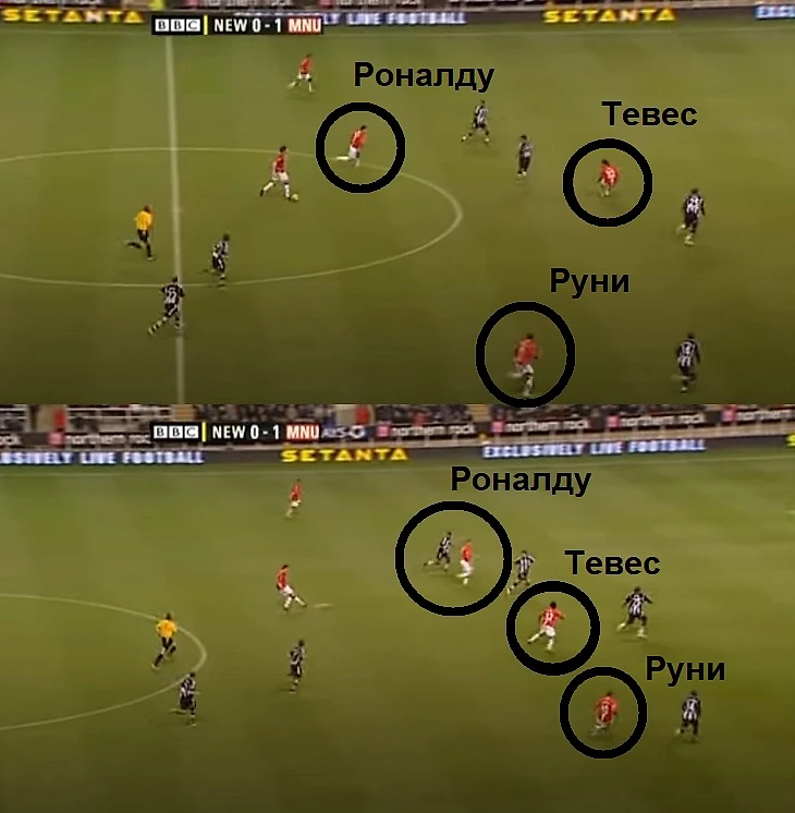 Но и это не все: в четвертьфинале против «Ромы» (Тевес не играл) Роналду вышел на острие, а Руни играл правого полузащитника; в победном полуфинале против «Барселоны» без Руни Роналду остался на острие, Тевес играл под ним.