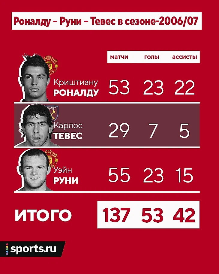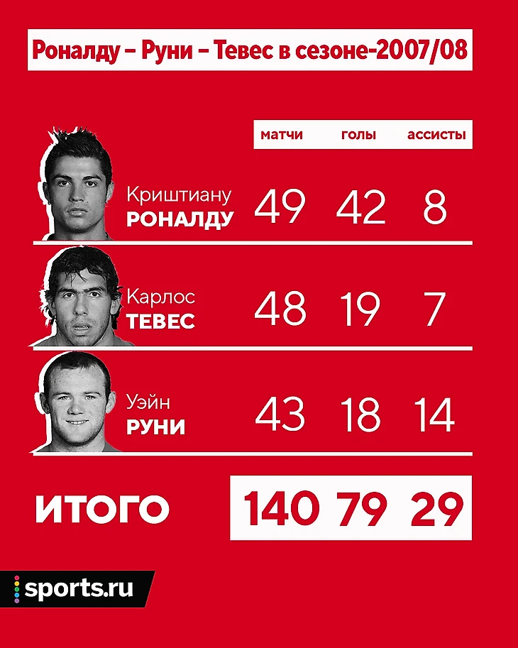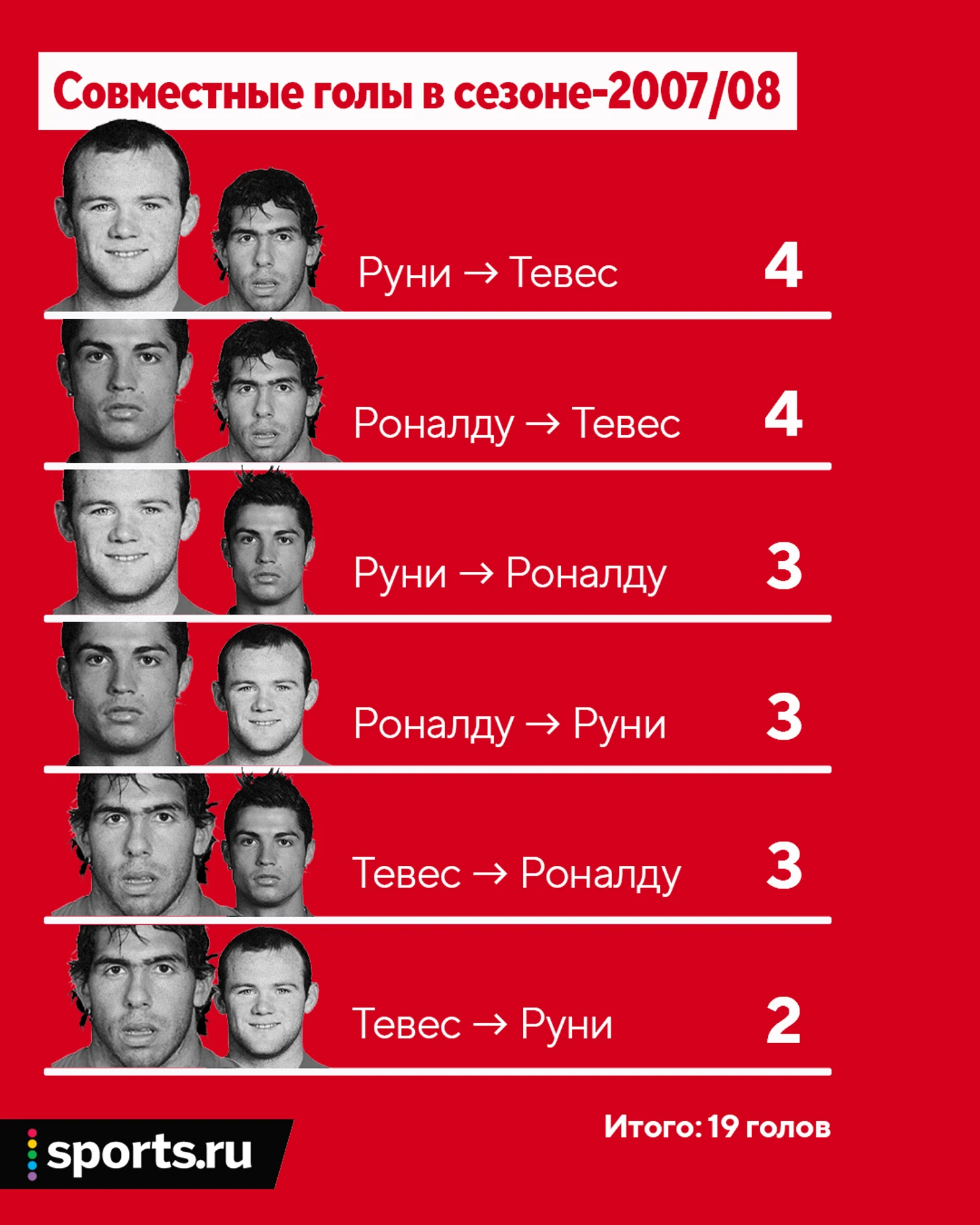 Троица собралась летом 2007-го: к Роналду и Руни добавили Тевеса, арендовав его у «Вест Хэма». В последнем туре предыдущего сезона «Юнайтед» уже в статусе чемпиона проиграл лондонцам: единственный гол забил 23-летний Карлос Тевес, который носился по всему полю.