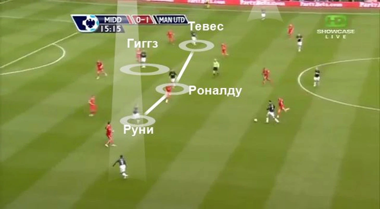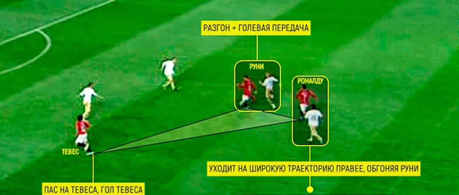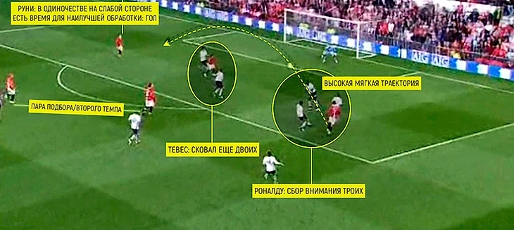 И вообще любой опеки. Еще раз процитируем разбор Саши Лебедева. Вот Тевес и Роналду стягивают на себя полкоманды. Руни просто стоит и ждет мягкой подачи от партнера.