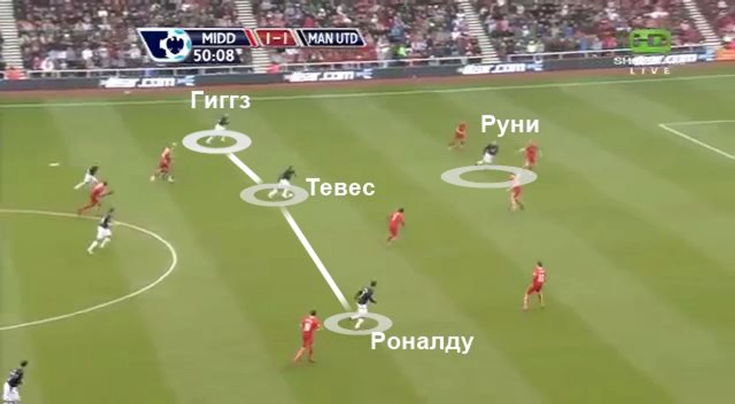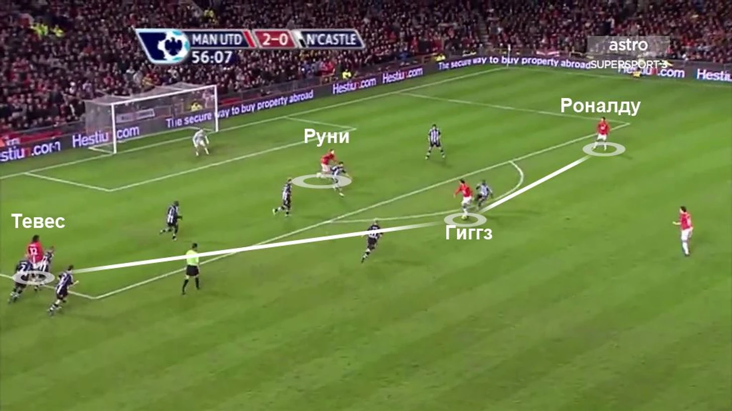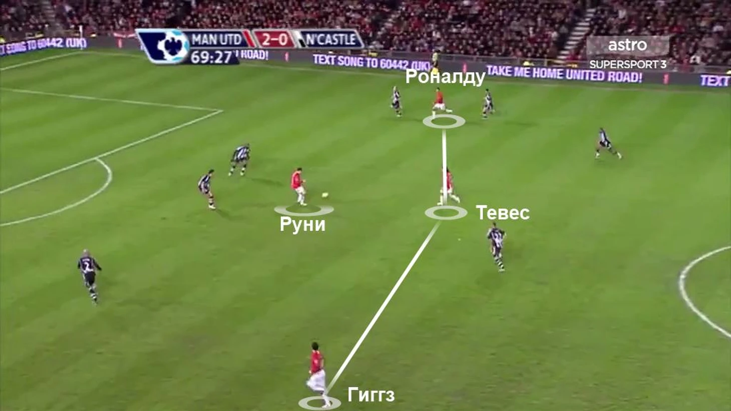 Тевес только что получил продвигающий пас от Кэррика и развернулся в зоне десятки – справа его поддерживает Гиггз, слева Роналду, впереди Руни: