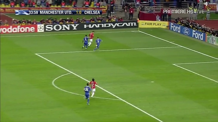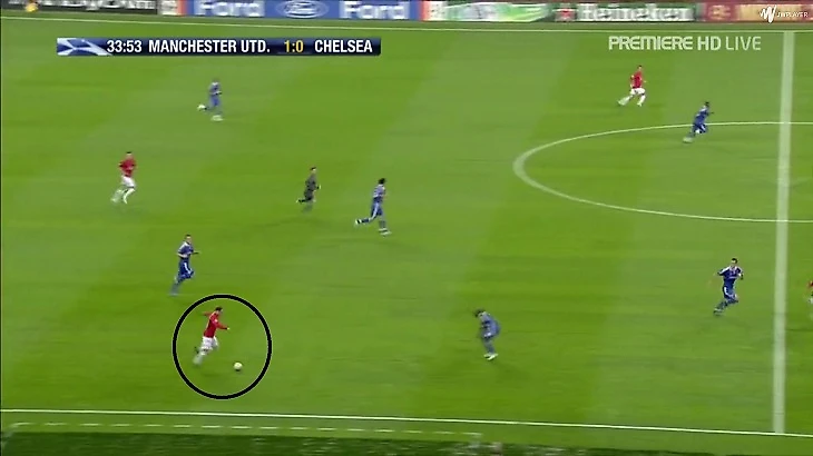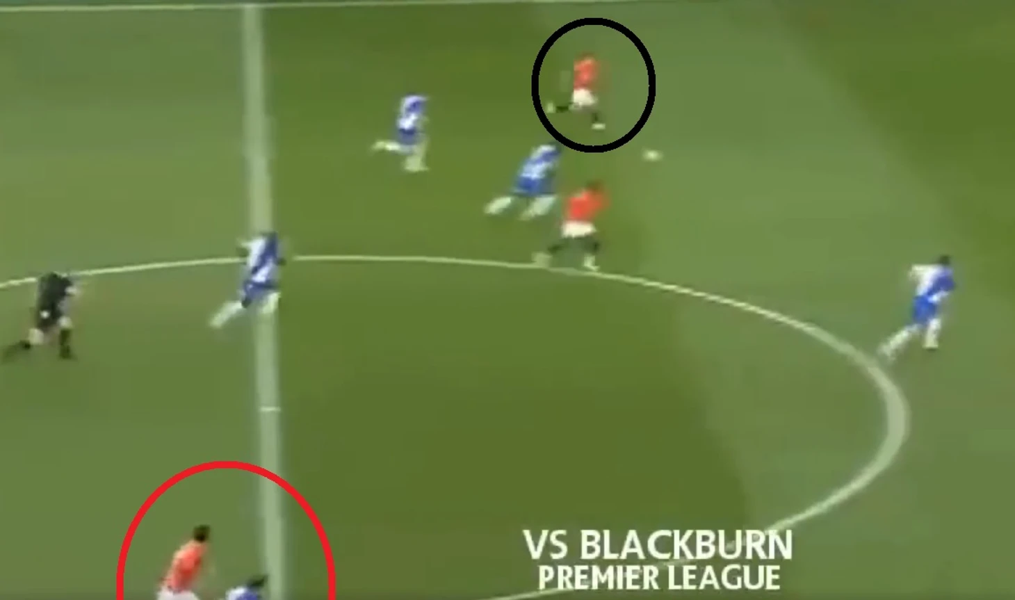 На скрине ниже черным кружком отмечен Тевес на фланге, красным – забегающий по центру Роналду. Через несколько секунд Криштиану обгонит вообще всех и в одиночестве примет мяч в штрафной «Блэкберна». Легчайший гол для португальца.