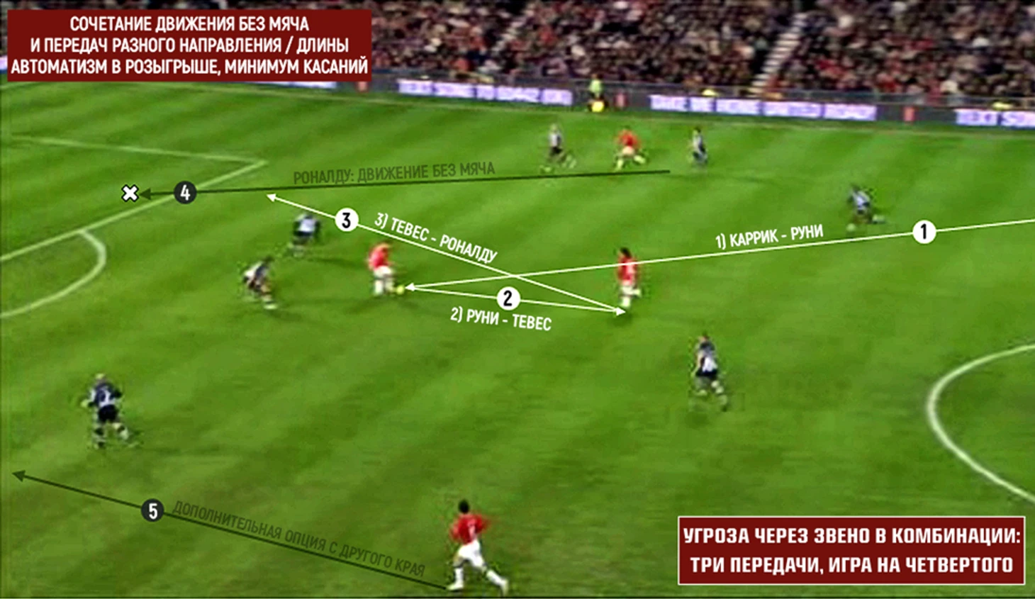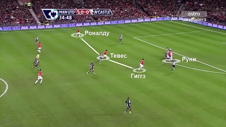 Еще один пример, теперь из домашнего матча с «Ньюкаслом». На скрине три типа передач, решающие разные задачи: Кэррик отдает на центрфорварда Руни, Уэйн сбрасывает на Тевеса в оттяжке. Центральные защитники реагируют на Уэйна и не замечают забегающего Роналду.