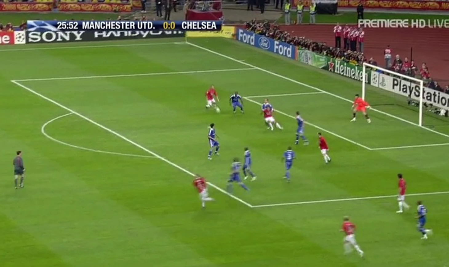 Кажется, пас получился не очень удобным, но быстрый португалец догоняет мяч и навешивает с левой в штрафную. Там нет ни одного защитника: Эссьен и Коул сместились на Роналду, Терри самый ближний из бегущих назад футболистов.