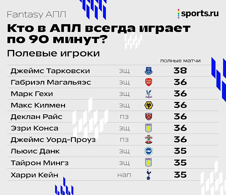 Среди полевых все 38 матчей полностью отыграл только Джеймс Тарковски из «Эвертона».