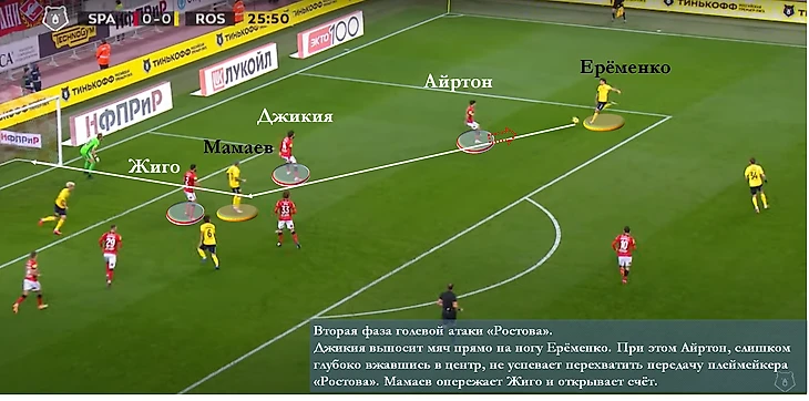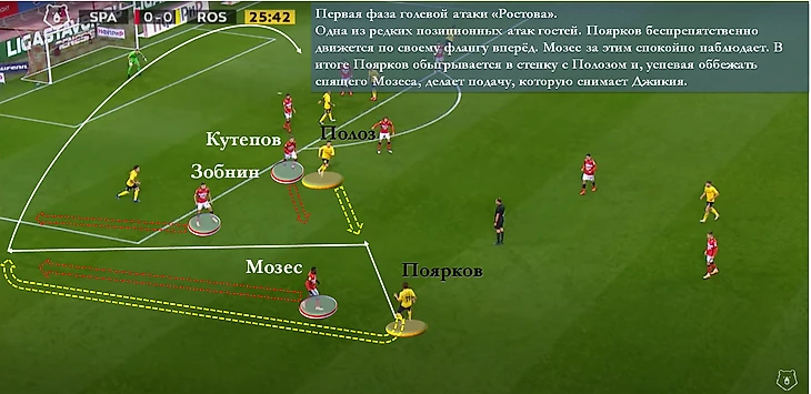По итогу, своим активным прессингом "Ростов" убил сразу двух зайцев: практически отрезал от игры фланги "Спартака" и тем самым прикрыл свою слабость на флангах обороны. В те редкие моменты, когда Айртон и Мозес всё-таки оказывались против своих оппонентов в атаке, Поярков и Козлов играли крайне неуверенно, позволяя создавать потенциально опасные ситуации у своих ворот. Однако стоило оппонентам поменяться ролями, и вот уже латерали "Спартака" в ключевой момент, как потом оказалось, всего матча проявили всю свою инертность при игре в защите.