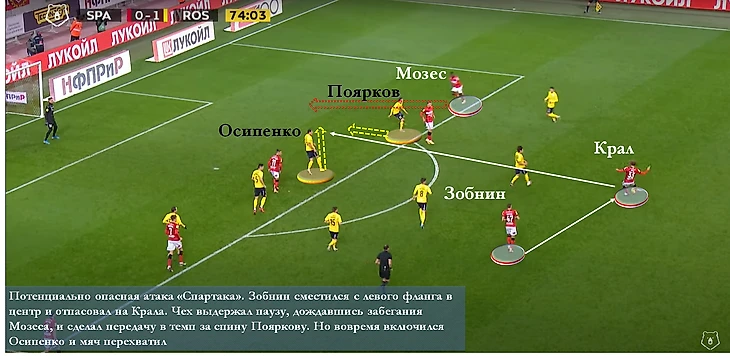 Соболев же добавил "Спартаку" вистов в борьбе за верховые мячи и обеспечил давление на центральную зону "Ростова". Однако подопечные Карпина сориентировались достаточно быстро: практически убрали высокий прессинг, создали компактность на своей половине поля и предложили "Спартаку" сыграть в позиционку. И оказалось, что красно-белые не сильно-то к этому были готовы. Нет, пару-тройку опасных ситуаций спартаковцы у ворот "Ростова", конечно, создали, но в целом игра перешла в разряд тех, когда одни не могут забить, а другие не очень-то этого хотят.