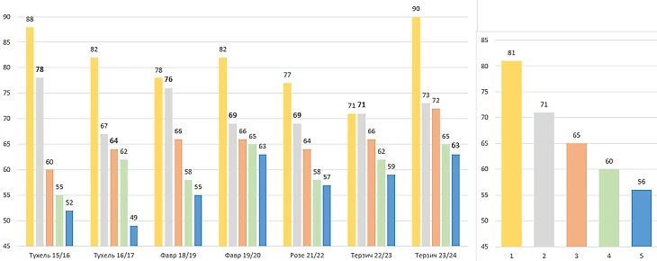 Сюда я включил только полные сезоны. Справа - усреднённые очки с 1 по 5 место.