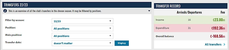 Трансферный баланс 2022 - (168.56). Из них покупки на (192.36) и продажи на 23.80
