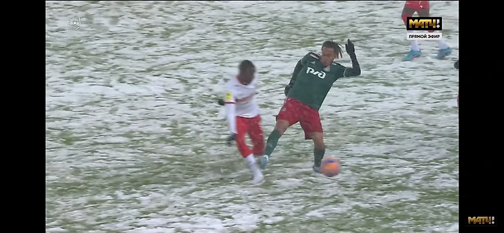 Вот в пол девятого вечера матч начинается. Но даже на таком поле мало что было видно. Смотря это через экран смартфона, я честно не видел во время трансляции мяча. Что осложняло восприятие матча, да к тому же было удивление, что матч решили продолжить, хотя «Спартак» не хотел играть. По итогу во время первого тайма было много падений. Джикия минимум валялся раза 2 в снегу, газоном, увы, это сложно было назвать.
