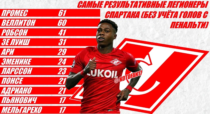 Весной далёкого 2018-го Квинси Промес стал самым результативным легионером в истории Спартака, обогнав по голам за красно-белых Веллитона. Однако имелась загвоздка: бразилец, в отличие от голландца, не был в Спартаке пенальтистом; поэтому по голам с игры (в т.ч. со штрафных) лидером продолжал оставаться Веллитон. И вот, забив с игры в ворота ахмата в 30-м туре, Квинси вышел на 1 место по данному показателю – среди всех легионеров в истории Спартака.