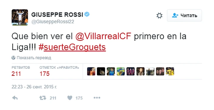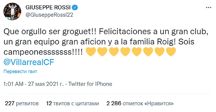 Когда осенью 2015 года Вильярреал впервые в истории возглавил таблицу Примеры, Джузеппе в твиттере поздравил команду с этим достижением. Не забыл Росси отправить поздравительный твит и после триумфа Подводников в Лиге Европы в сезоне 2020-21.