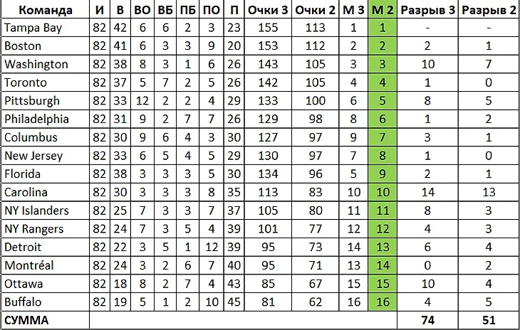На Востоке мы наблюдаем ровно ту же самую картину, с одним существенным исключением: вместо "Коламбуса" в ПО попала бы (причем с гораздо более высокого места) "Флорида", одержавшая на 8(!) побед больше в основное время, чем "голубые жакеты" и на 5 - чем "пингвины" из "Питтсбурга".