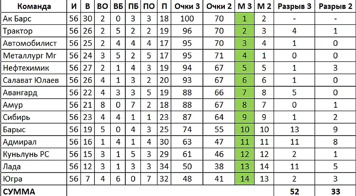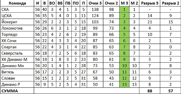 Опять-таки: общая плотность выросла, но на погоню за попадание в ПО это никак не сказалось бы: "Барысу", ушедшему в долгосрочное пике еще в декабре, что 9 очков отставания, что 13 было не отыграть. "Сибирь" же, занявшая в итоге 9-е место и недосчитавшаяся всего балла до заветной восьмерки, при двухочковой системе недосчиталась бы еще одного (в результате обесценивания побед в основное время).