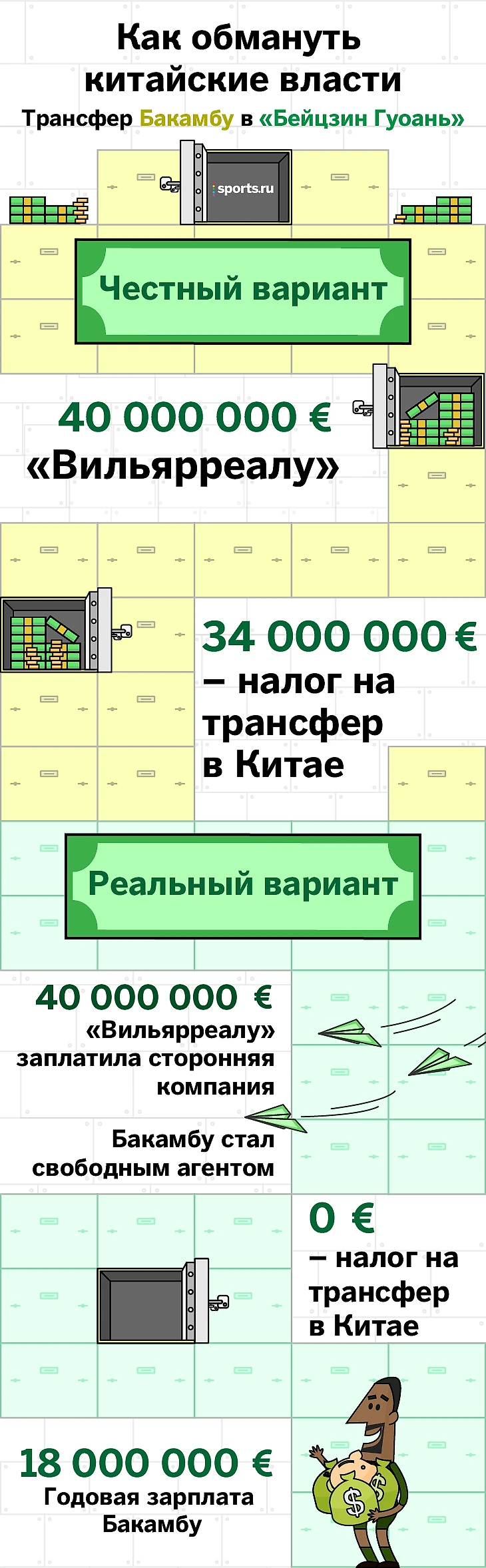 Китайский клуб, разочарованный плохим сезоном (всего 9-е место в чемпионате), был готов выкупить Бакамбу за 40 миллионов евро. Но сделка осложнялась жестким правилом китайской федерации футбола: если клуб тратит на трансфер из-за границы более 45 миллионов юаней (примерно 6 млн евро), то должен заплатить 100-процентный налог на превышение. В итоге родилась такая хитрая схема.