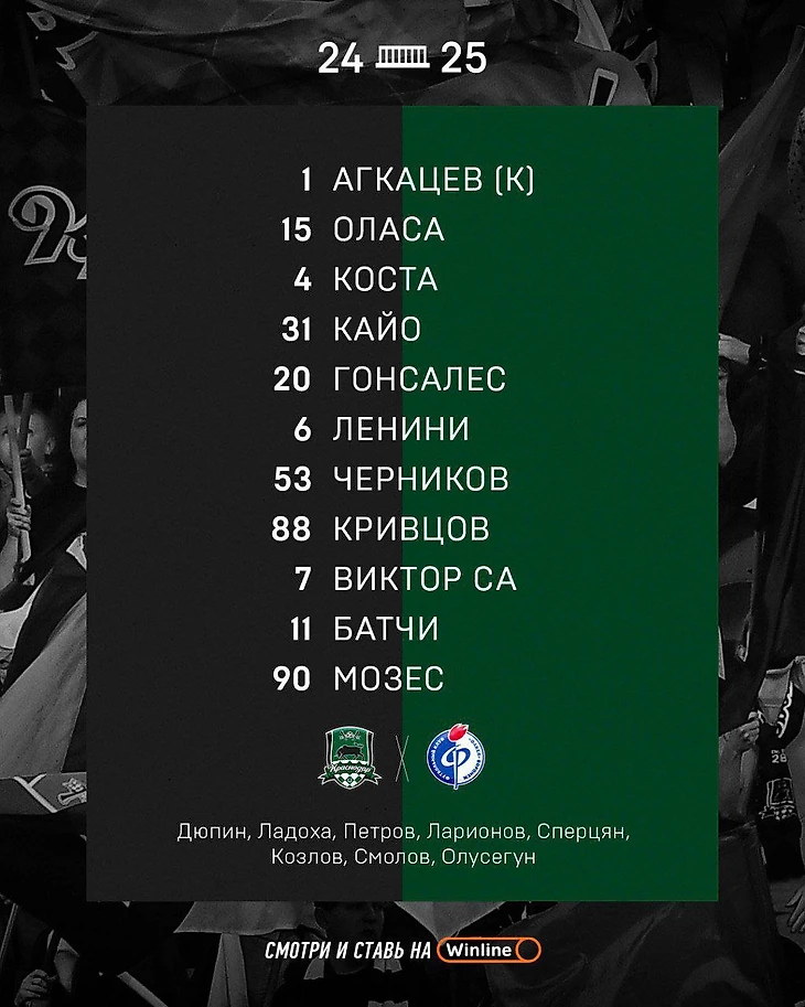 У «Краснодара» базово как обычно минимум изменений. Главным из них стал вынужденный выход забившего 6 голов в последних двух матчах Мозеса на острие вместо дисквалифицированного Кордобы. Тормена вопреки прогнозам не успел восстановиться до воскресенья и не попал в заявку. Также окончательно застолбил себе место в основе Гонсалес.