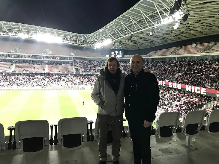 Футбольный агент Дмитрий Селюк выложил в твиттере фотографию с главным тренером московского "Локомотива" Юрием Палычем Семиным с матча чемпионата Франции Ницца-Бордо.