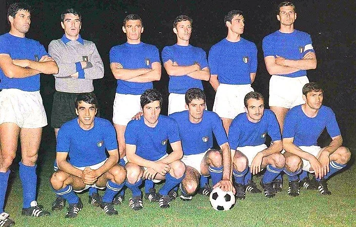 После войны эра Витторио Поццо подошла к концу. Долгое время итальянцы не появлялись на верхушках форумов. Только в 1968-м на дебютном чемпионате Европы Италия продемонстрировала былое величие. Тут можно прибегнуть к воспоминаниям вашего покорного слуги. Одной из первых запоминающихся вещей в футболе стала винтажная наклейка от «Панини» с той самой сборной Италии 68-го. Насколько круто и лаконично выглядели их лазурные футболки. Эх, на фоне будто вспыхивает кисленькое шипение газировки «Сан-Пелегрино» и скрежет тормозов велосипеда «Бьянчи».