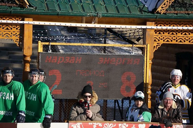 Можно, конечно, и кое-что улучшить. Большая площадка перед администрацией города НЕ ВЛЕ-ЗА-ЕТ. Приходится играть четыре на четыре, без пробросов и с буллитами вместо удалений. Впрочем, для шоу это скорее хорошо: и зрителям веселее, и игрокам, большая часть из которых регулярно играет только в Ночной хоккейной лиге 40+, не надо слишком много бегать.