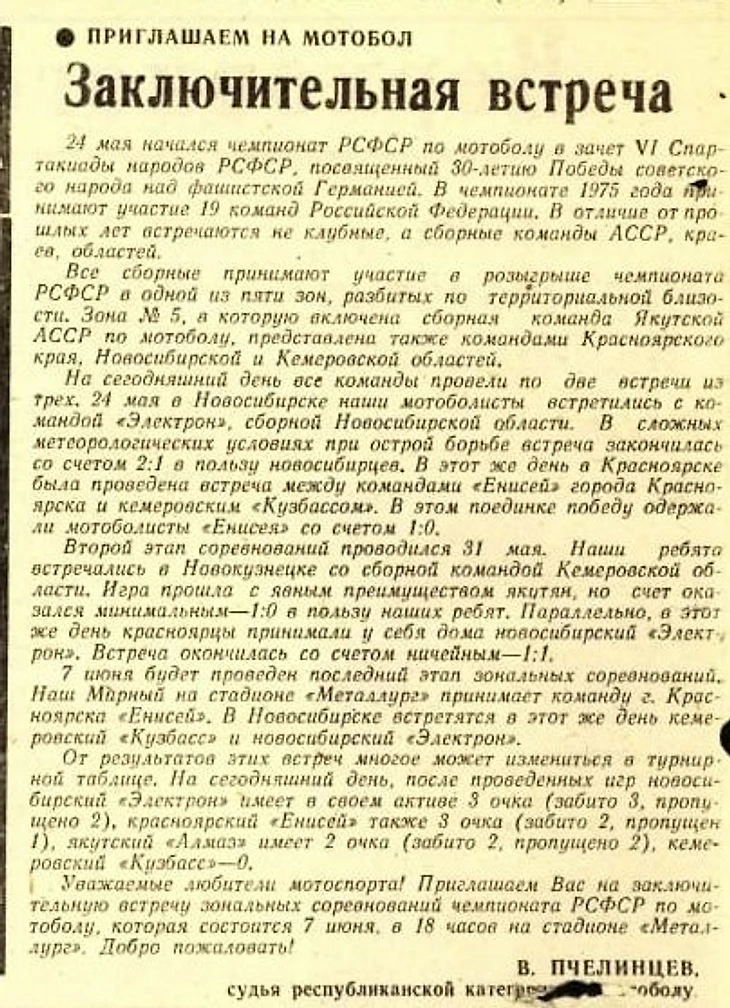 Лишь в 2022-м, только после того, как я поучаствовал в создании вышедшей книги «Мотобол в СССР», на авторский коллектив вышел Сергей Соколов из Санкт-Петербурга, который много лет собирал материалы по истории мотобола в Сибири и особенно в Якутии. Без него этот текст был бы решительно невозможен. Если вам кажется, что тут не хватает фотографий или каких-то комментариев от участников событий, то скажу, что на данной стадии, кажется, мы сделали все, что могли в плане поиска. Возможно, кто-то даст о себе знать после публикации этого текста.