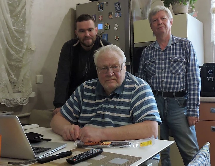 Слева направо: Дмитрий Крюков, Валерий Мосин, Олег Лебедев во время разбора мотобольных архивов советского времени