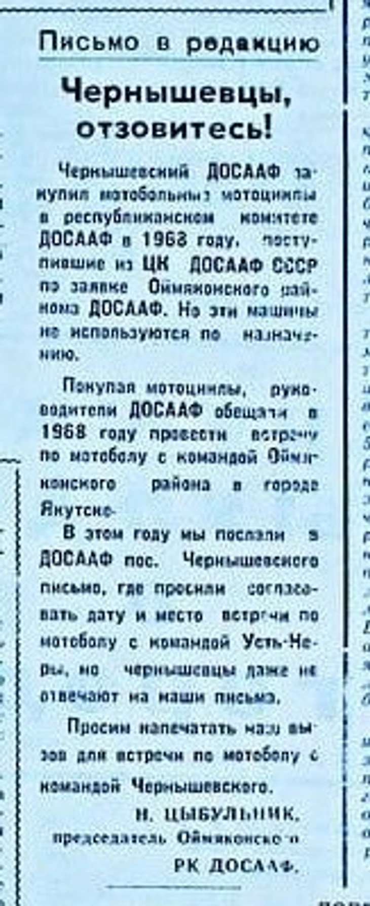 Председатель Оймяконского райкома ДОСААФ Цыбульник рассказывал газете «Социалистическая Якутия»:
