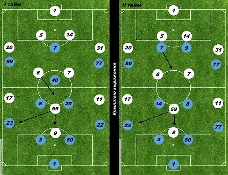 Но ключевым тактическим ходом второго тайма стал выход Зиньковского, который, на сей раз не ушел на родной левый фланг, а расположился на правой бровке. Именно это, вкупе с травмой Чорлуке в концовке игры позволило «Крыльям» сравнять счет. Вероятно, вместо упустившего Соболева Крыховяка, в этом месте должен был находиться хорват, который к тому времени уже был заменен на Мурило, из чьей зоны и был забит мяч.