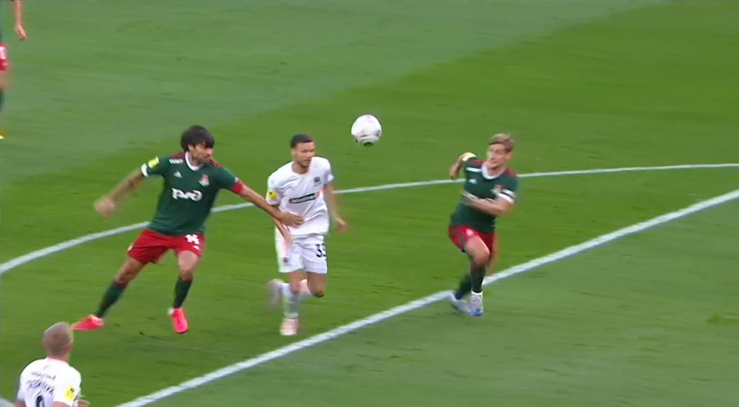 Чуть позже, буквально спустя пару минут, произошел очень спорный эпизод в штрафной площади ворот "Локомотива". Капитан железнодорожников Ведран Чорлука хватал за рукав футболки Маркуса Берга. Данный эпизод "проворонил" главный арбитр встречи Кирилл Левников. Лишь спустя некоторое время, благодаря подсказке от VAR, Левников сам пошел к монитору разбирать этот спорный момент.