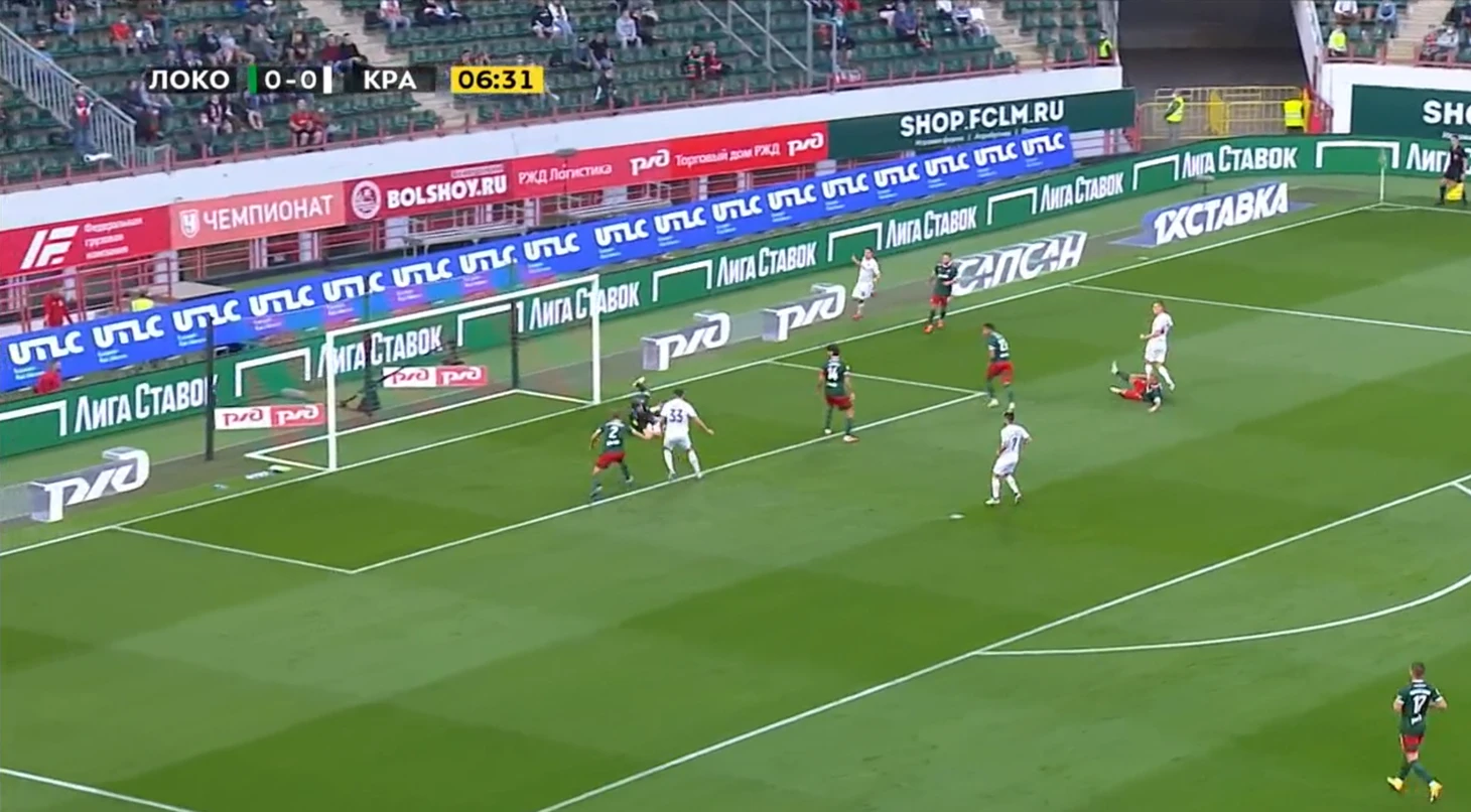Голевого момента могло и не быть, если бы Дмитрий Баринов оказался немного расторопнее, то успел бы заблокировать удар Уткина. Но в итоге блокировать удар пришлось Гильерме. В этом моменте многое сошлось в пользу "Локо". Пробил Уткин слабовато, но и Маринато не сплоховал.