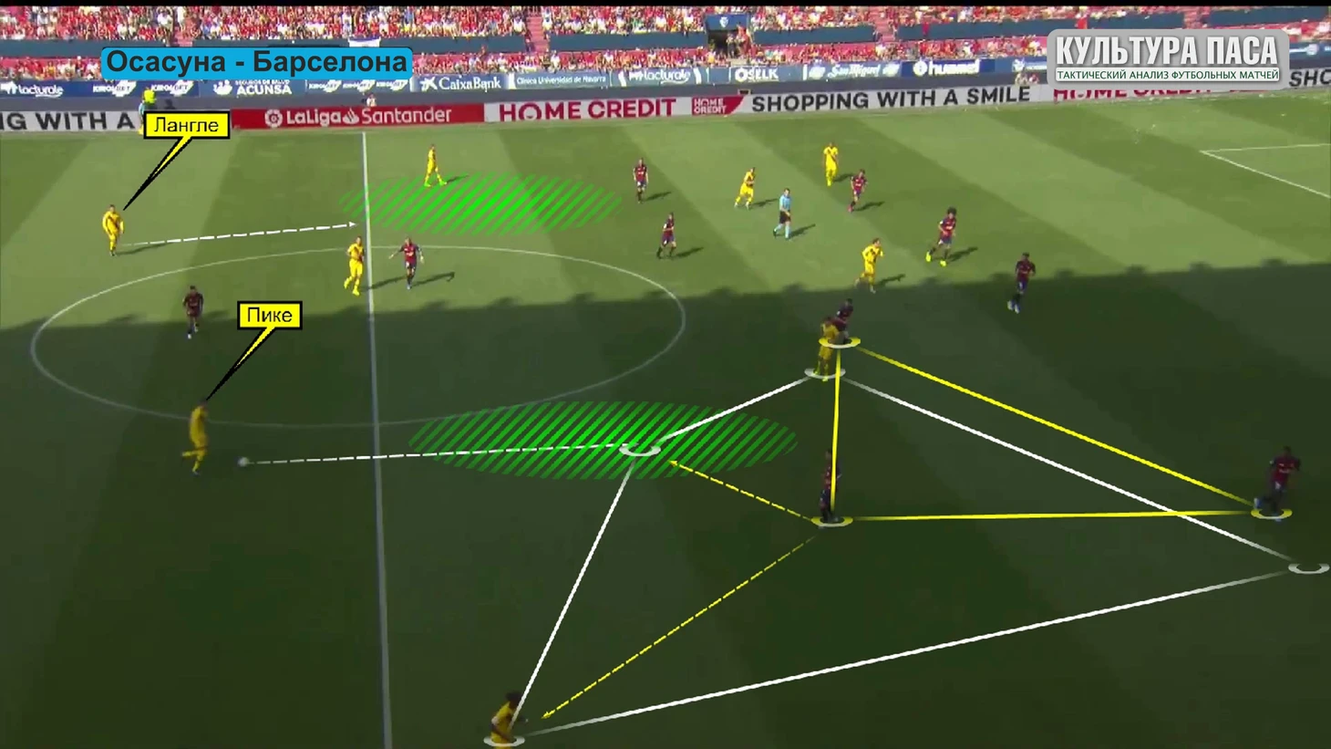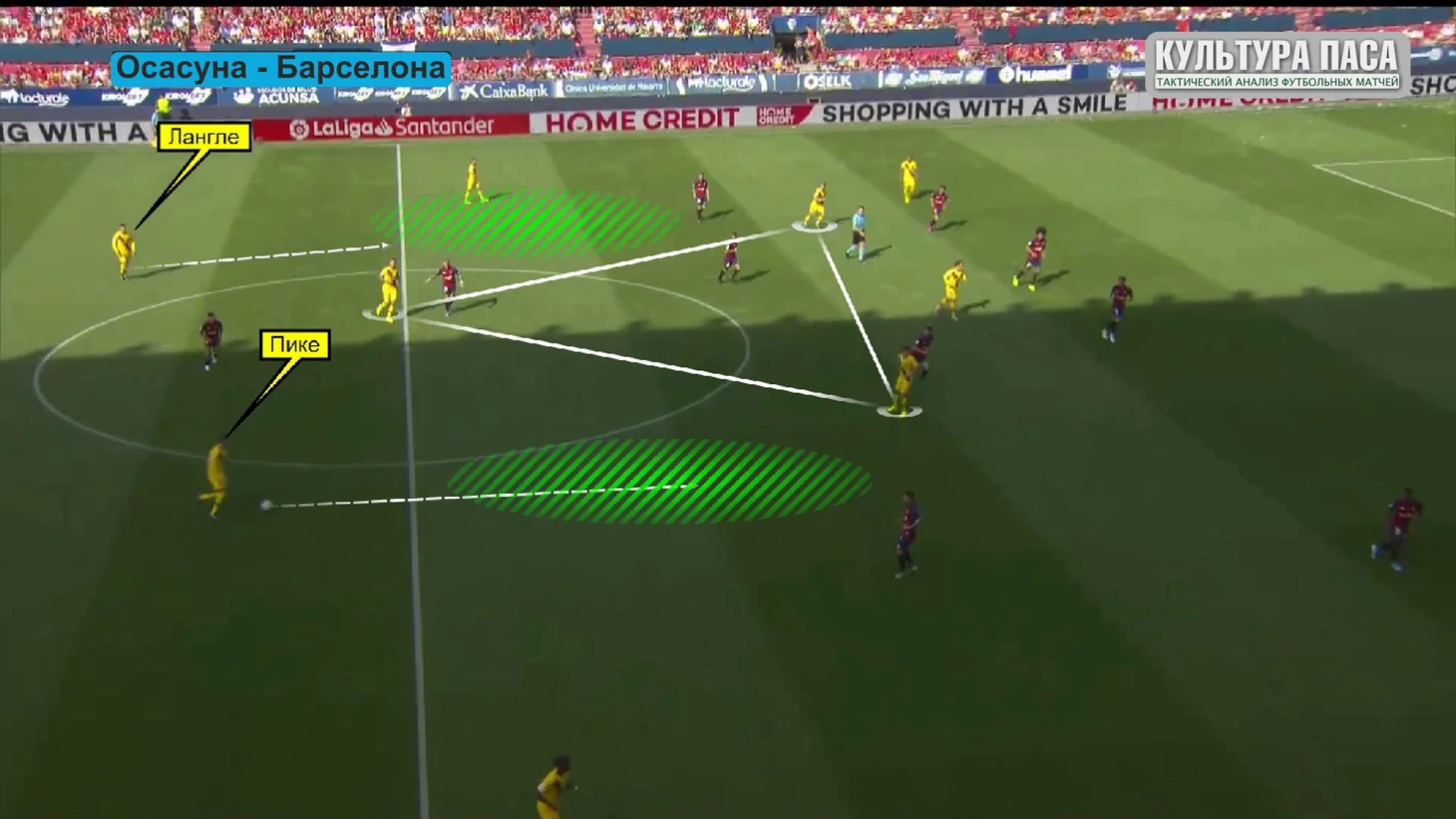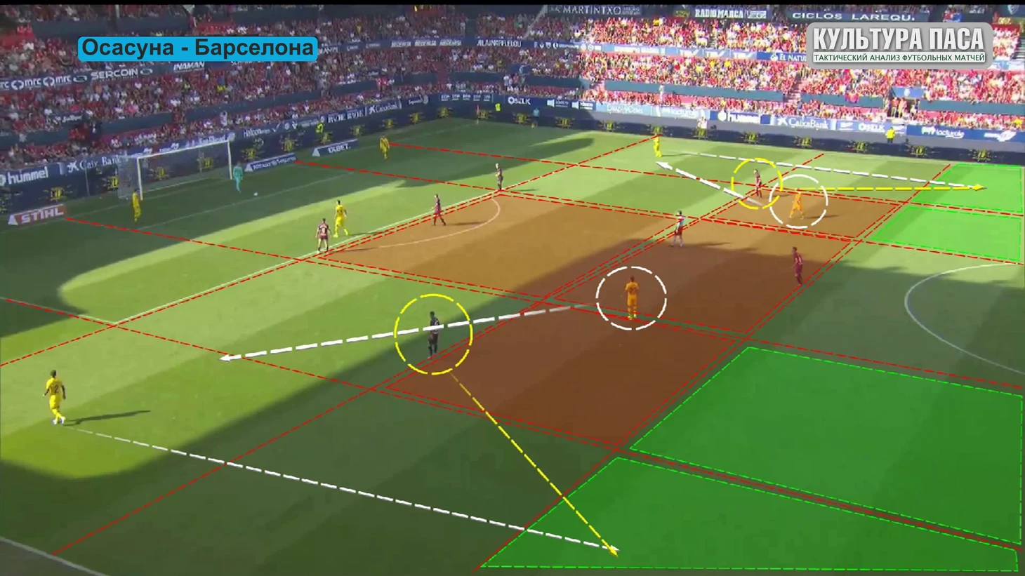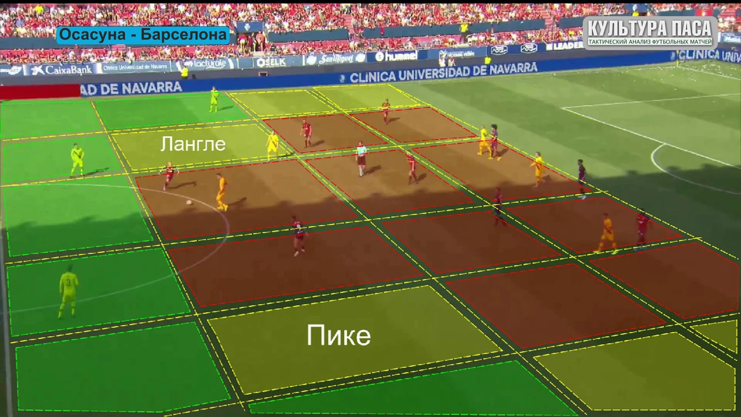 Бускетс в этом эпизоде чуть выше, Осасуна так же в прежней схеме, я ее буду показывать весь обзор потому что так лучше видно как хорошо покрывается пространство хозяевами поля. Посмотрим какие зоны для приема мяча оставляет Осасуна. Линия защиты и линия полузащиты блокирует все продвижение по центру. Нападающие сковывают Бускетса и заставляют его быть лишь транзитной точкой между Лангле и Пике. Фланги, помеченные желтым более менее пригодные для передач, например диагонали. Ну и зеленым те сектора где можно поднять голову, как бы сказал Аррасате, вот там вон пожалуйста катайте. Две зоны для продвижения Лангле и Пике, желтые но на самом деле там тоже можно попасть под прессинг.