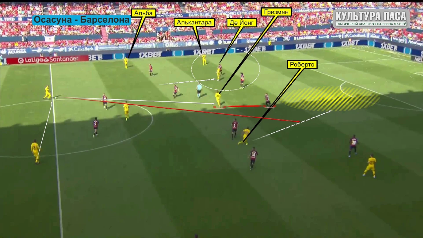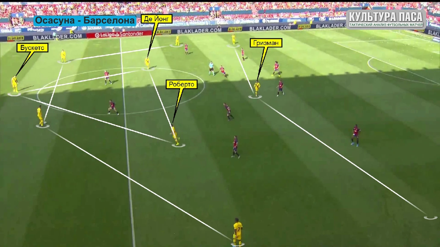 Давайте посмотрим на расстановку осасуны в этом матче. с самого начала и до конца, Аррасате тренер Осасуны использовал четыре четыре два, самую популярную схему для использования контратакующего футбола. Сконцентрированы игроки в центре поля, оставляя барселоне фланги. хотя , глядя на работоспособность и высокую интенсивность хозяев, я бы сказал, что они не дали и флангов для сине-гранатовых. Барселона верна себе и Вальверде, использует четыре три три при атаке. Бускетс де йонг и роберто тройка хавов, Гризманн по центру нападения, Перес и Рафинья на флангах. Довольно глубокое расположение Бускетса заставляло его партнеров по полузащите играть тоже ниже в первые минуты матча. фактически Бускет играл третьего центрального защитника.