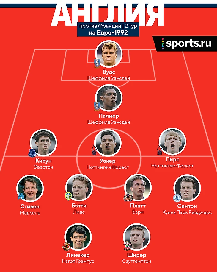 Но это не самая важная новость этого матча. Самое важное, что Англия не выпустила в старте ни одного игрока «Ливерпуля» и «МЮ». Такого не было с Евро-1992. Тогда в матче второго тура группы А Англия играла против Франции. Тот матч закончился со счётом 0:0. Но кто тогда защищал цвета «трёх львов», и за какие клубы они играли.