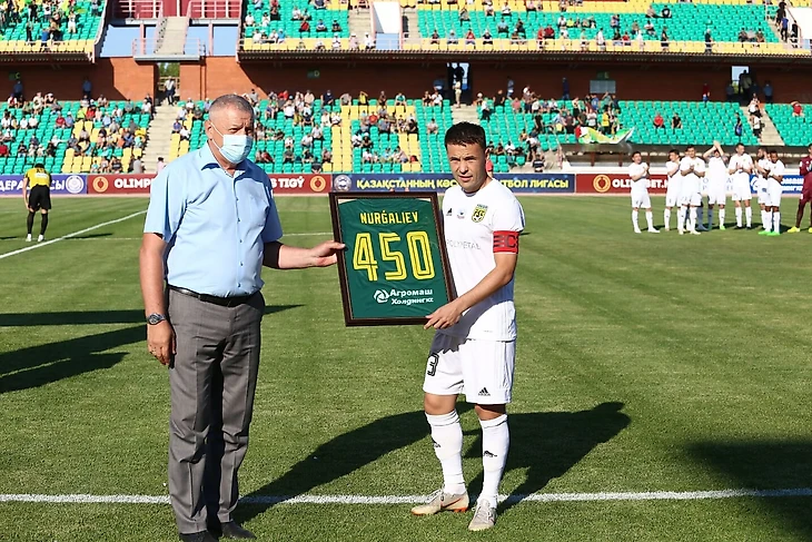 Перед началом капитану костанайцев Азату Нургалиеву вручили памятную футболку – выйдя против «Жетысу», он сыграл свой 450-й матч в КПЛ.