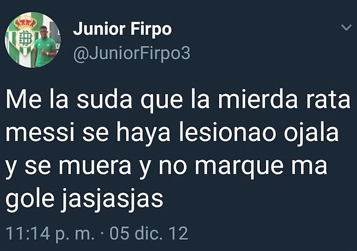 Да, чисто формально можно изобразить в своей голове ситуацию, при которой несмышленый 15-летний игрок пишет гадости о Месси (то просто желая ему найти того, кто «переломает ему ноги», то называя его «с***ным сыном», то называя его «крысиным д***мом» и желая ему «умереть и больше не забивать голы») из-за своей неразумности в юном возрасте, вот только ситуация совсем иная, чем принято ее преподносить у тех, кто, подобно обезьяне из бородатого анекдота, хочет быть одновременно «умной и красивой» (считаться болельщиком Месси, получив при этом Фирпо в команду). Да, Фирпо писал ту мерзость преимущественно в 2012-ом году, когда ему было 15 лет, вот только история не закончилась на этом: когда он в первый раз заявил о себе в футбольном мире (в феврале 2018-го, когда и состоялся его дебют за главную команду «Бетиса»), пользователи твиттера откопали те сообщения. Что сделал на тот момент 21-летний, уже «не» глупый и неразумный парень? Просто дни спустя взял и удалил свой твиттер-аккаунт @JuniorFirpo3, а в марте 2018-го года на просторах этой соцсети появился @JuniorFirpo03. Все свои публичные извинения предусмотрительный Хуниор сохранил до лета 2019-го, когда эти извинения получили солидный вес в ежесезонных миллионах евро.