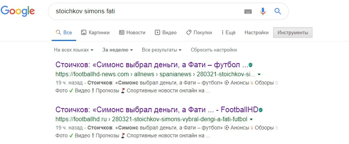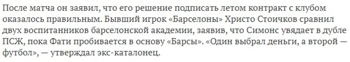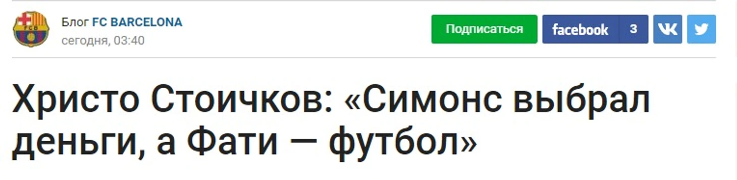 Блог свидетелей порядочности Бартомеу и Вальверде выдал перепечатку «интервью Стоичкова» с сайта footballhd.ru. Проблема в том, что это «интервью» не существует в природе больше ни на одном сайте, Стоичков никогда не говорил о Фати и Симонсе (как минимум, в одном высказывании этого не было), что можно понять после 2-3 минут поиска в Гугле и Твиттере. Но ведь целью было вылить помои на «алчного» Симонса и восхититься Фати, который и в 20 лет может остаться в «Барсе Б», потому здесь не на что смотреть.