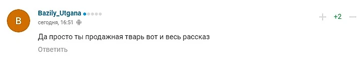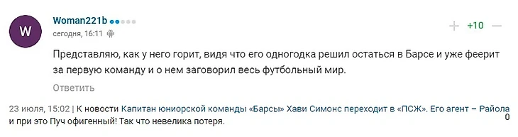 Постебалась над Симонсом, подколов его тем, что игрок другого амплуа играет за «Барсу». Симонс там «горит», а мог бы остаться и феерить, подобно Рики. Из других 105 комментариев лишь в одном упоминание Пуча. Самое смешное - как раз по поводу ухода Симонса. «Невелика потеря» и «офигенность Пуча» за 2 с половиной месяца подзабылись, пока не пришло время потроллить голландца. А ведь Симонс мог бы лет до 20 играть за «Барсу Б», чтобы уже с его фамилией на устах можно было махнуть на очередного покинувшего клуб кантерано.