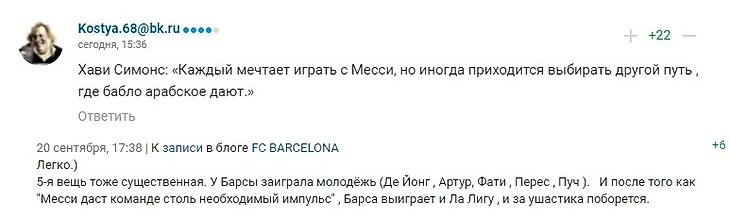 Точно понял, что 16-летний парень из-за «бабла арабского» ушел. Из других 199 комментариев (вплоть до 25 августа) только в одном упомянул имя или фамилию Рики, при этом 20 сентября (к тому времени «Барса» огласила 6 заявок на матчи, ни в одной не было Пуча) четко понял, что «У Барсы заиграл Пуч», указав его в ряду с 2 наемниками (купить за сотню миллионов двух игроков и восхищаться тем, что они играют??), из-за которых, в том числе, Пуч и не выходит на поле. Не мог не упомянуть Месси в восхитительных тонах для увеличения плюсо-доходности комментария.
