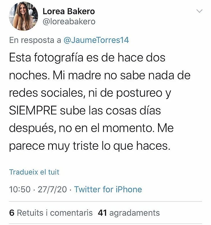 В ответ на разразившийся скандал от семьи Бакеро оправдываться делегировали дочку Лорею, которая в ответ Торресу написала: «Эта фотография был снята двумя ночами ранее. Моя мать не умеет пользоваться загрузками в соцсетях и всегда загружает их дни спустя, не в тот же день. Очень печально то, что вы творите».