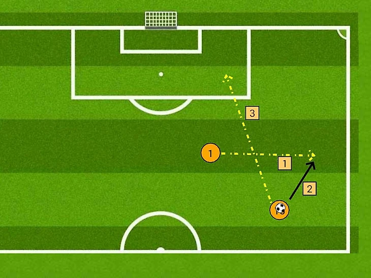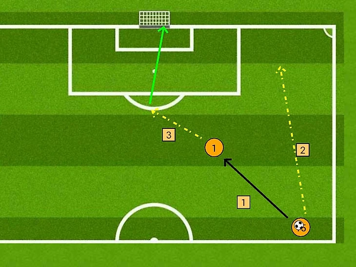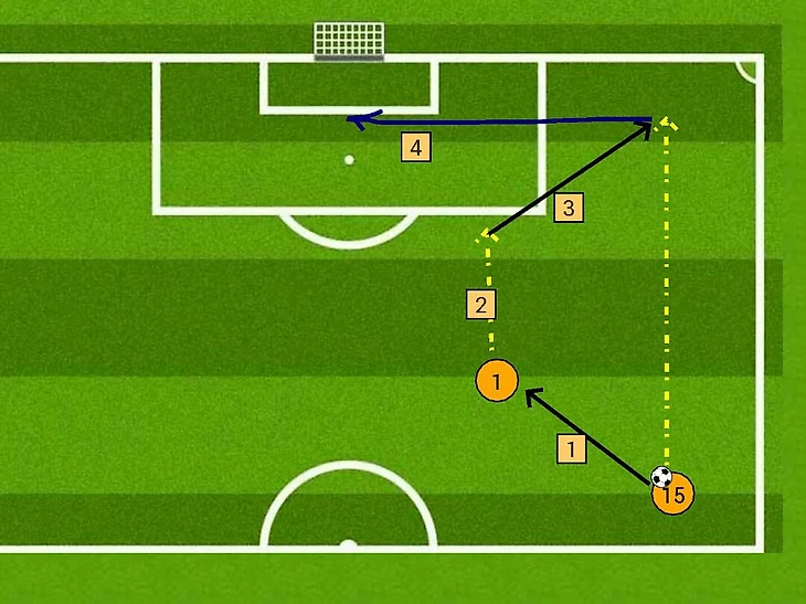 Оранжевыми фишками отмечены игроки "Урала". Под цифрой 15 подразумевается Денис Кулаков, под 1 - игрок, выступающий на позиции правого полузащитника. Пунктирные стрелки - передвижения игроков, черная стрелка - пас низом, синяя - навес, а зеленая - удар по воротам.